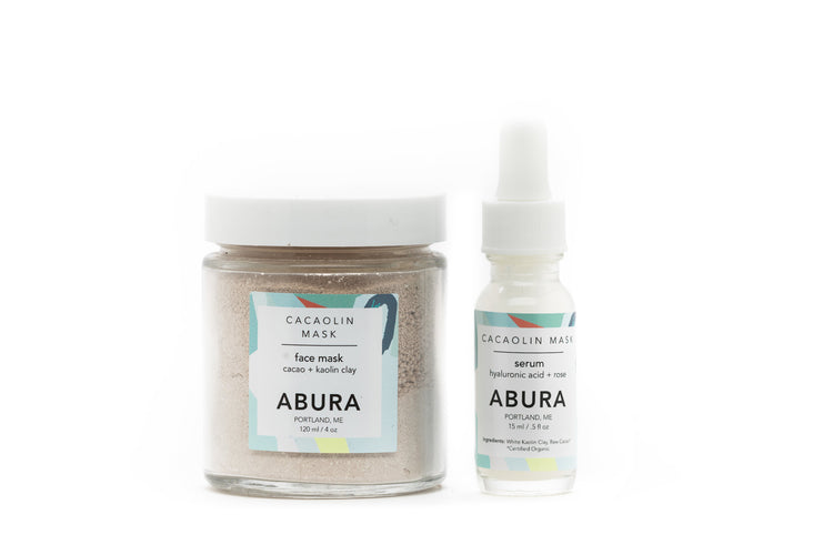 The Cacaolin Mask is made with White Kaolin Clay, and Anti-Oxidant rich Organic Raw Cacao Powder. The mask powder is accompanied by a .5 oz (15ml) jar Mask Serum, containing Hyaluronic Acid, Aloe Vera and Bulgarian Rose Essential Oil.